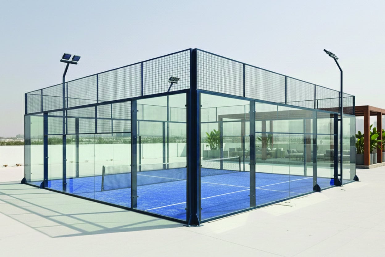 Padel courts use 10–12mm tempered glass panels to create the enclosure walls.